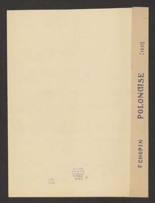 pl-text: Strony bez numerów; s. [2-3]: nuty, s. [1, 4]: puste.], Pages without numbers; p. [2-3]: sheet music, p. [1, 4]: blank., [pl-text: Stopka, s. [2]: Mieczysław Idzikowski - wydawca nut - Warszawa 1943 r..], Footline, p. [2]: Mieczysław Idzikowski - wydawca nut - Warszawa 1943 r.., [pl-text: Pieczęć "BIBLIOTEKA | Warszawskiego | Tow. Muzycz.".], Stamp "BIBLIOTEKA | Warszawskiego | Tow. Muzycz., [pl-text: Strona [1]: bez tytułu, wzdłóż prawej krawędzi przyklejony paierowy pasek z wydrukowanym napisem "F. CHOPIN [odstęp] POLONAISE [odstęp] (1821)".], Page [1]: untitled, paper tape stuck along the right edge, with the printed inscription "F. CHOPIN [space] POLONAISE [space] (1821)".