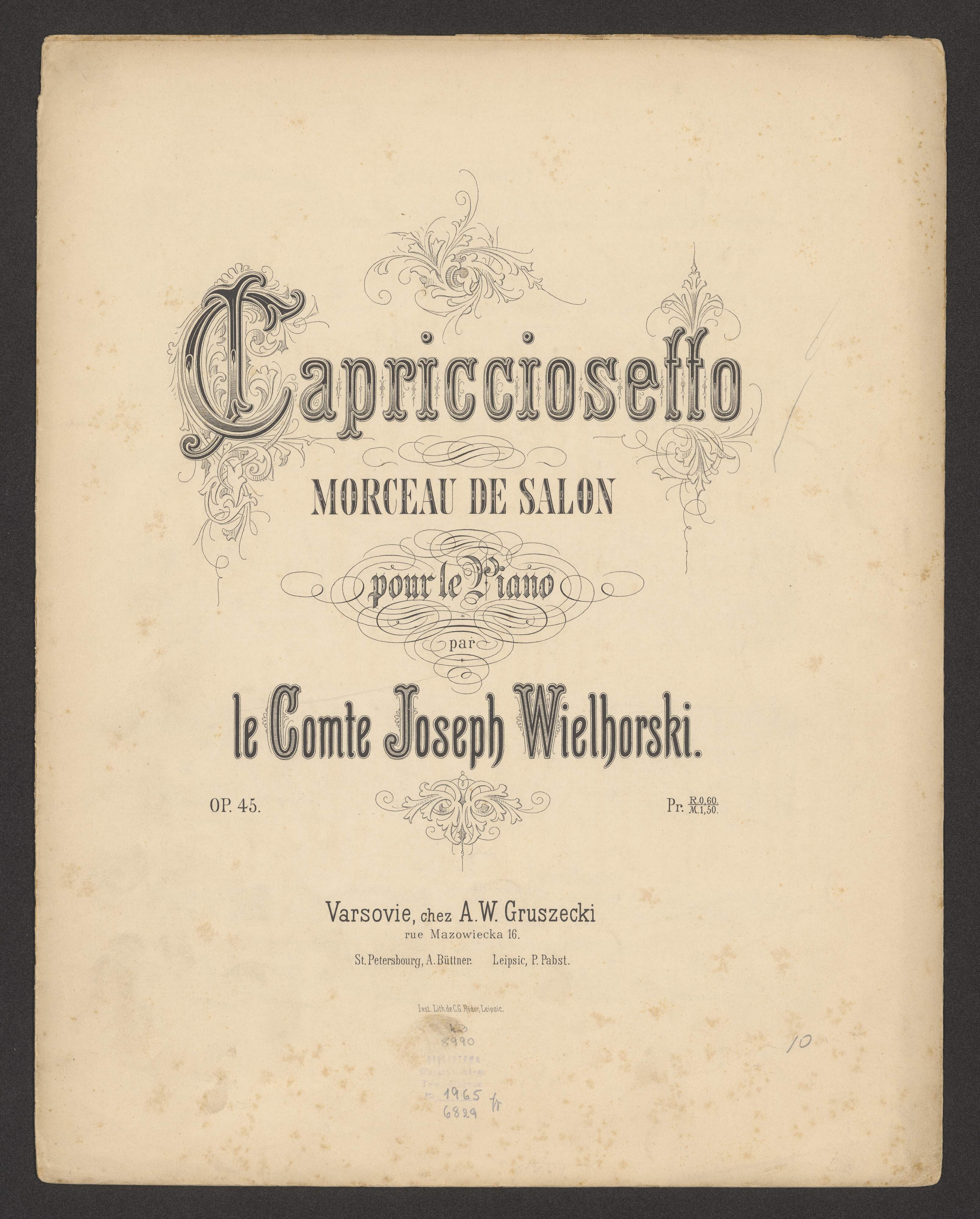Capricciosetto | MORCEAU DE SALON | pour le Piano | par | le Comte Joseph Wielhorski. | OP. 45. | Pr. | R.0,60.|M.1,50. | Varsovie, chez A. W. Gruszecki | rue Mazowiecka 16. | St. Petersbourg, A. Büttner. Leipsic, P. Pabst. | Inst. Lith. de C. G. Röder, Leipsic