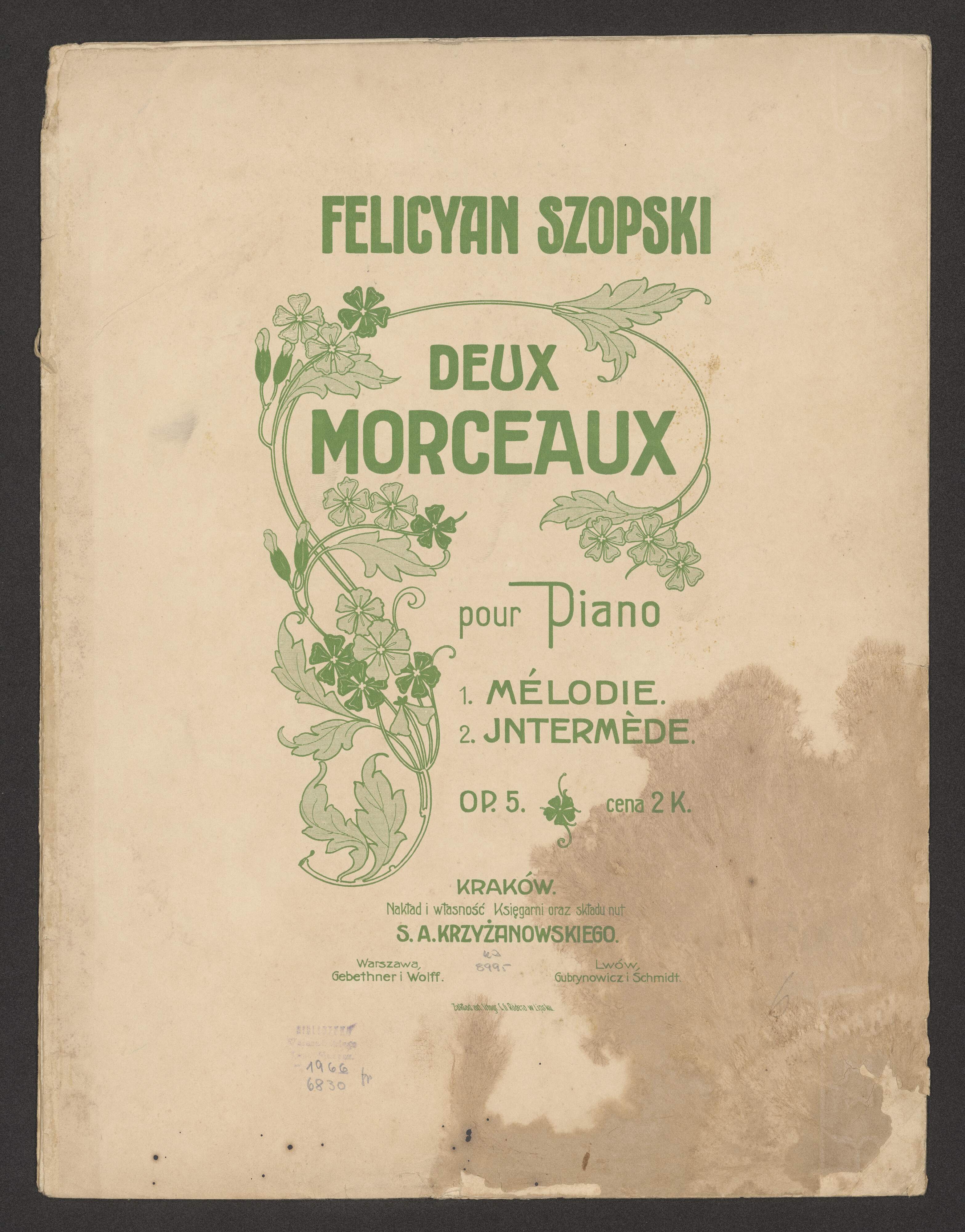 FELICYAN SZOPSKI | DEUX MORCEAUX | pour Piano | 1. MÈLODIE. | 2. JNTERMÈDE. | OP. 5. | cena 2 K. | KRAKÓW. | Nakład i własność Księgarni oraz składu nut | S.A. KRZYŻANOWSKIEGO. | Warszawa, | Gebethner i Wolff. | Lwów, | Gubrynowicz i Schmidt. | Zakład art. litogr. C. G. Rödera w Lipsku