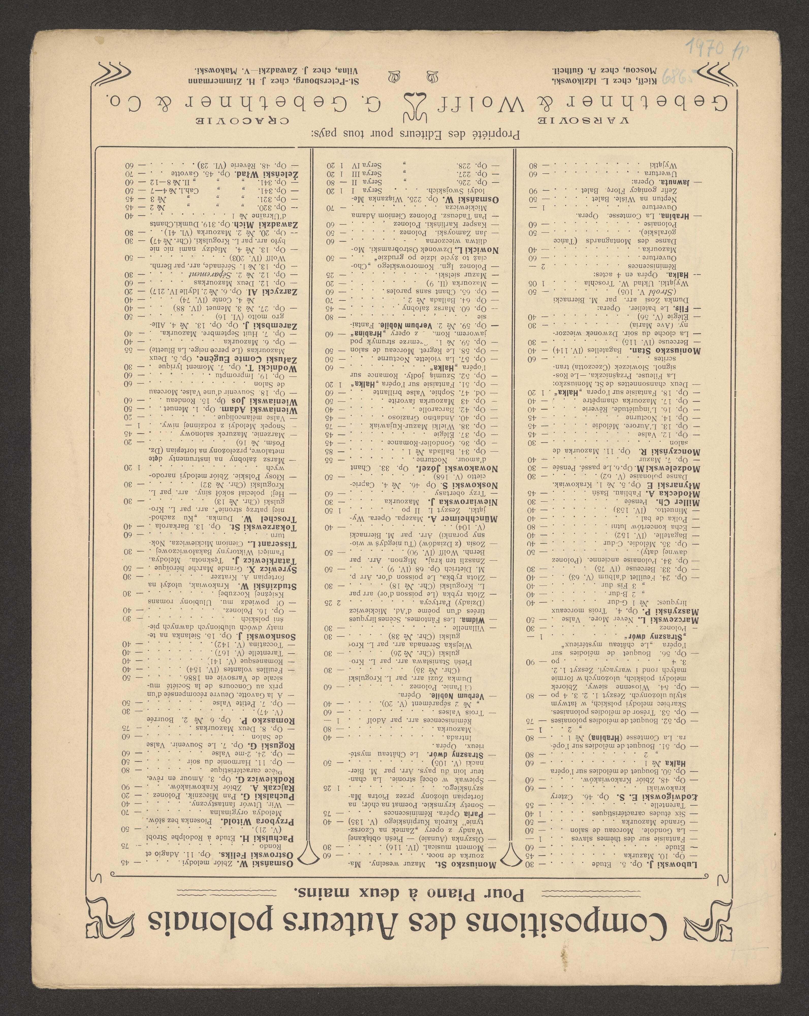 Compositions des Auteurs polonais | Pour Piano à deux mains | [list of compositions in three columns] | Propriété des Editeurs pour tous pays: | VARSOVIE | Gebethner & Wolff | Kieff, chez L. Idzikowski. | Moscou, chez A. Gutheil. | CRACOVIE | G. Gebethner & Co. | St.-Petersbourg, chez J. H. Zimmermann | Vilna, chez J. Zawadzki - V. Makowski
