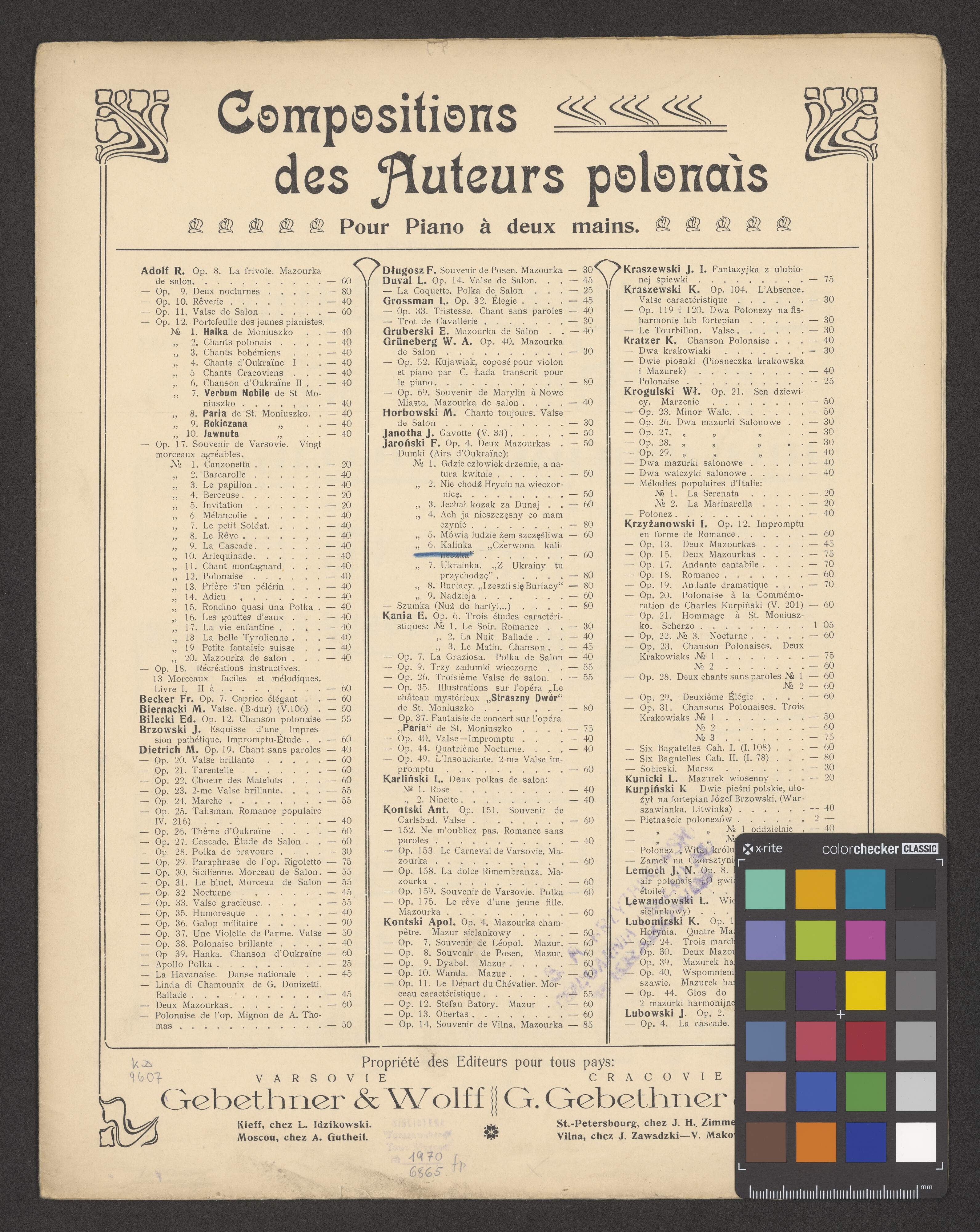 Compositions des Auteurs polonais | Pour Piano à deux mains | [list of compositions in three columns] | Propriété des Editeurs pour tous pays: | VARSOVIE | Gebethner & Wolff | Kieff, chez L. Idzikowski. | Moscou, chez A. Gutheil. | CRACOVIE | G. Gebethner & Co. | St.-Petersbourg, chez J. H. Zimmermann | Vilna, chez J. Zawadzki - V. Makowski