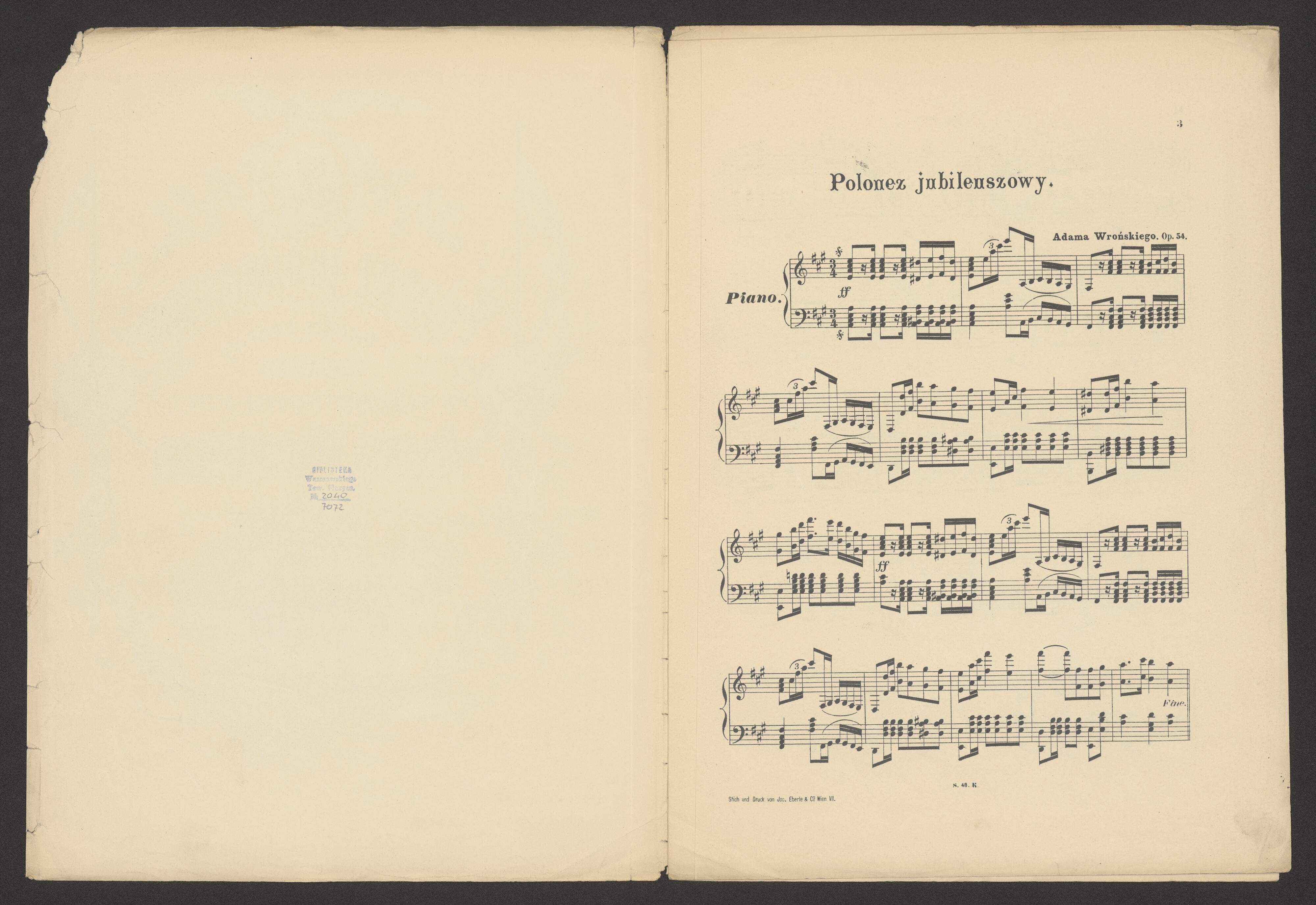 Polonez jubileuszowy | w rocznicę odsieczy | WIEDEŃSKIEJ | na fortepian napisany przez | ADAMA WROŃSKIEGO | Dyrektora orkiestry. | Dzieło 48. | Cena 60 centów. | Nakład i własność księgarni oraz składu nut. | S. A. Krzyżanowskiego. | S. 48 K. | Musikaliendruckerei v. Jos. Eberle & C|o. Wien. VII. |