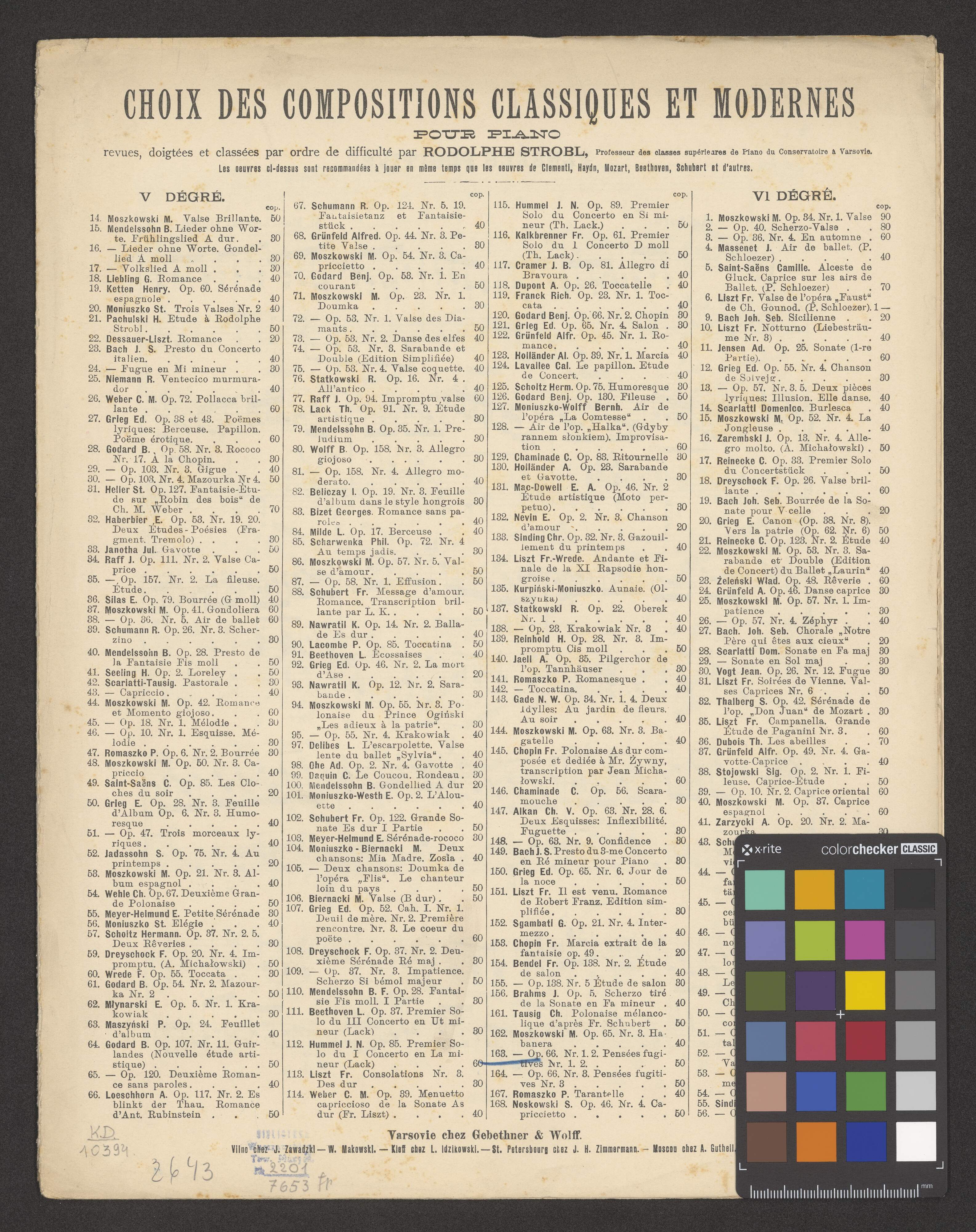 CHOIX DES COMPOSITIONS CLASSIQUES ET MODERNES | POUR PIANO | revues, doigtées et classées par ordre de difficulté par RODOLPHE STROBL Professeir des classes supérieures de Piano du Conservatoire à Varsovie. | Les souvres ci-dessus sont recommandées à jouer on méme temps que les oeuvres de Clementi, Haydn, Mozart, Beethoven, Schubert et d'autres. | [list of compositions in four columns] | Varsovie chez Gebethner & Wolff | Vilno chez J. Zawadzki - W. Makowski. - Kieff chez L. Idzikowski/. - St. Petersbourg chez J. H. Zimmermann - Moscou chez A. Gutheil