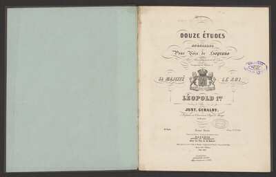 Etude numbers 7-12., [pl-text: Numery etiud 7-12.], Title page; blank page; pp. 1-29: score; blank page., [pl-text: Karta tytułowa; pusta strona; s. 1-27: partytura; pusta strona.], Print covered with cover added later. On the cover a paper sticker with the notation: "Douze Etudes | pour Voix de Soprano | par | Just. Geraldi | II Suite". At the upper corners of the sticker, in different ink, the numbers "1049" and "70" written and crossed out. On the sticker affixed an oval purple stamp crossed out: "BIBLIOTEKA | No | Konserw Muz w Warszawie" with the number "2131". Below the gold oval stamp: "KONSERWATORIUM | MUZYCZNE | W WARSZAWIE". On the back cover a sticker printed: "Biblioteka Państwowej Wyższa | Szkoły Muzycznej - Warszawa" with current signature below., [pl-text: Druk obłożony okładką dodaną później. Na okładce papierowa naklejka z zapisem: "Douze Etudes | pour Voix de Soprano | par | Just. Geraldi | II Suite". W górnych rogach naklejki innym atramentem zapisane i skreślone numery "1049" i "70". Na naklejce umieszczona owalna fioletowa pieczęć przekreślona: "BIBLIOTEKA | No | Konserw Muz w Warszawie" z numerem "2131". Poniżej złota owalna pieczęć: "KONSERWATORIUM | MUZYCZNE | W WARSZAWIE". Na odwrocie okładki naklejka z nadrukiem: "Biblioteka Państwowej Wyższej | Szkoły Muzycznej - Warszawa" z umieszczoną poniżej aktualną sygnaturą.], Crossed out oval purple stamp: "BIBLIOTEKA | No | Konserw Muz w Warszawie" with number "2131" on title page, p. 1; oval green stamp crossed out: "BIBLIOTEKA | INSTYTUTU | MUZYCZNEGO" on title p; black stamp: "W WARSZAWIE | u F|R|: SPIESS i KOMP: | Ulica Senatorska N|o|460." on title page; blue/purple circular stamp: "Państwowa Wyższa Szkoła Muzyczna w Warszawie | BIBLIOTEKA | Nr" with number "28725" on p. 1; without number on p. 11, p. 29; small, blue, rectangular stamp: "BIBLIOTEKA GŁ. | AM im. Fr. Chopina | w Warszawie" on p. 17., [pl-text: Przekreślona owalna fioletowa pieczęć: "BIBLIOTEKA | No | Konserw Muz w Warszawie" z numerem "2131" na k. tytułowej, str. 1; owalna zielona pieczęć przekreślona: "BIBLIOTEKA | INSTYTUTU | MUZYCZNEGO" na k. tytułowej; czarna pieczęć: "W WARSZAWIE | u F|R|: SPIESS i KOMP: | Ulica Senatorska N|o|460." na k. tytułowej; okrągła niebieska/fioletowa pieczęć: "Państwowa Wyższa Szkoła Muzyczna w Warszawie | BIBLIOTEKA |Nr" z numerem "28725" na str. 1; bez numeru na str. 11, str. 29; mała, niebieska, prostokątna pieczęć: "BIBLIOTEKA GŁ. | AM im. Fr. Chopina | w Warszawie" na str. 17.], [pl-text: Owalna fioletowa pieczęć: "BIBLIOTEKA | No | Konserw Muz w Warszawie".] 51043250, [pl-text: Owalna zielona pieczęć: "BIBLIOTEKA | INSTYTUTU | MUZYCZNEGO".] 51043250, [pl-text: Czarna pieczęć: "W WARSZAWIE | u F|R|: SPIESS i KOMP: | Ulica Senatorska N|o|460.".] 51043250