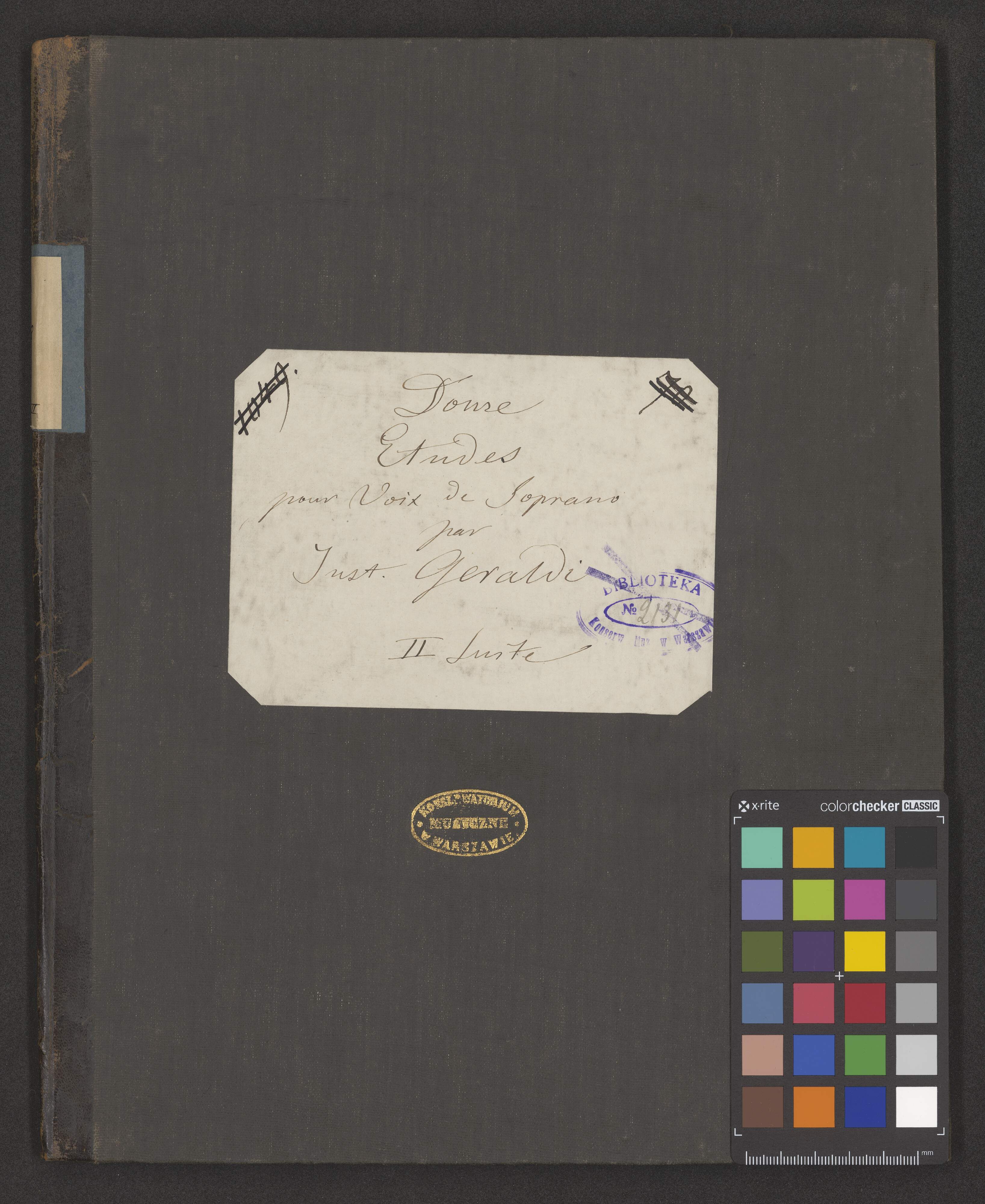 [title page:] DOUZE ÉTUDES | SPÉCIALES | Pour Voix de Soprano | Avec Accompagnement de Piano | Composées et dédiées à | SA MAJESTÉ [emblem] LE ROI | LÉOPOLD 1|e|r| | Par | JUST. GERALDY. | Professeur au Conservatoire Royal de Musique | de Bruxelles | [on the left:] 2||e| Suite. [space] Deux Suites. [on the right:] Chaque Pr. 2 fl. 24 kr. | Propriété des Editeurs. Euregistré aux Archives de l'Union. | MAYENCE | ANVERS ET BRUXELLES | chez les fils de B. Schott. | Dépôt général de notre fonds de Musique: à Leipzig chez G|m|e| Haertel. à Vienne chcez H.F. Müller. | Paris, chcez l'Auteur | 6784-6785