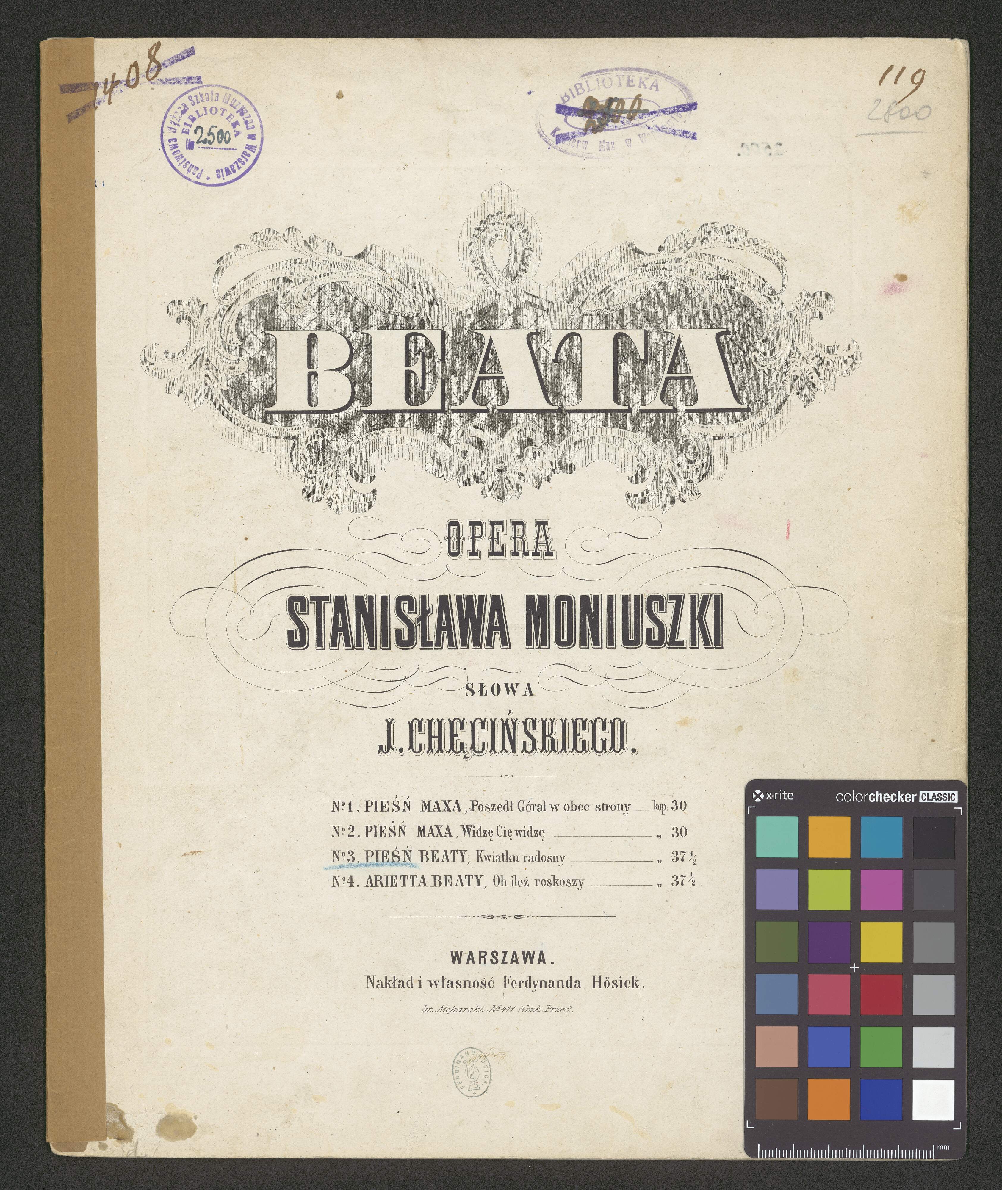 BEATA | OPERA | STANISŁAWA MONIUSZKI | SŁOWA | J. CHĘCIŃSKIEGO | [list of compositions] | WARSZAWA | Nakład i własność Ferdynanda Hösick