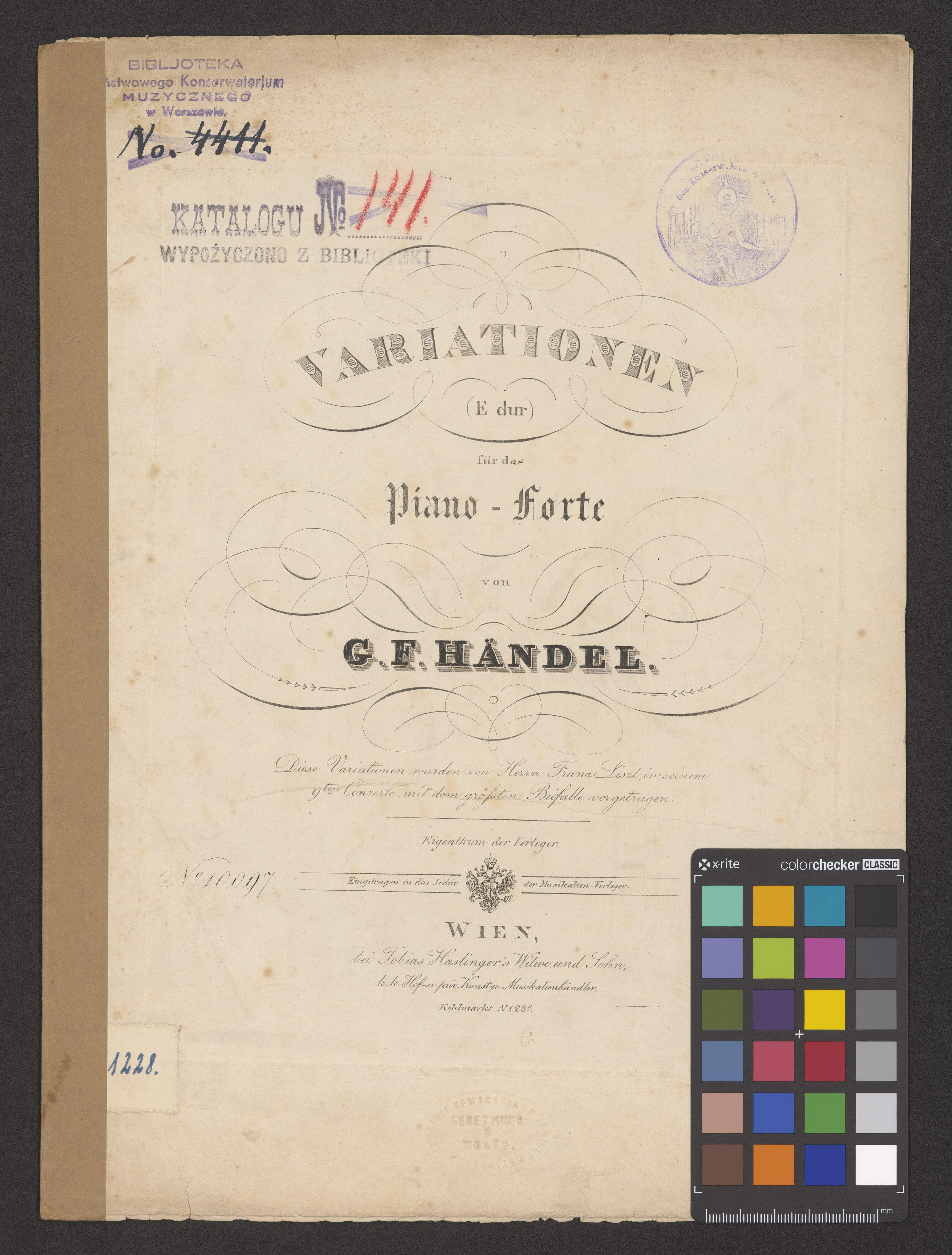 [title page:] VARIATIONEN | (E dur) | für das | Piano - Forte | von | G.F.HÄNDEL. | Diese Variationen wurden von Herrn Franz Liszt in seinem | 9|t|e|n| Conzerte mit dem gröfsten Beifalle vorgatragen.| Eigenthum der Verleger. | N|o| 10,097. [space] Eingetragen in das Archiv [emblem] der Musikalien Verleger. [space] Preis 24 x C.M. | WIEN, | bei Tobias Haslinger's Witwe und Sohn, | k.k. Hoft-u. priv. Kunst-u. Musikalienhändler, | Kohlmarkt N|o| 281