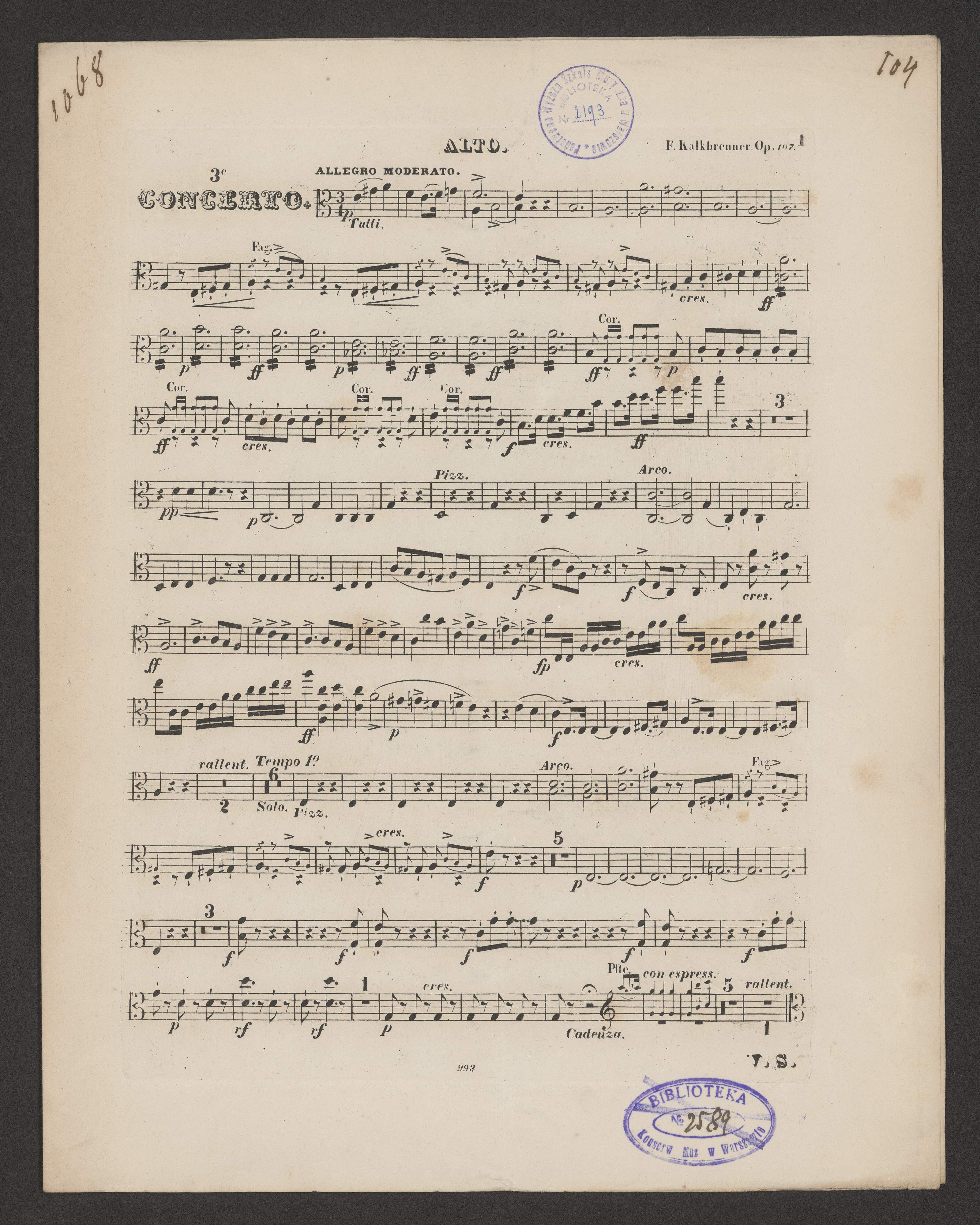 [title page:] TROISIÈME | CONCERTO | pourl le | PIANOFORTE | avec Accompagnement d'Orchestre | composé et dédié | à son Excellence le Prince | TALLEYRAND | par | F. KALKBRENNER. | Oeuv. 107. [space] {pr. avec Accomp.3/23 Rthl/ | pr. sans Accomp.11/2 Rthl. | Propriété des Editeurs. | Euregistré aux Archives de l'Union. | Leipzig, chez Fr. Kistner. | Paris, chez Pleyel & C|o| | 993. | 1013