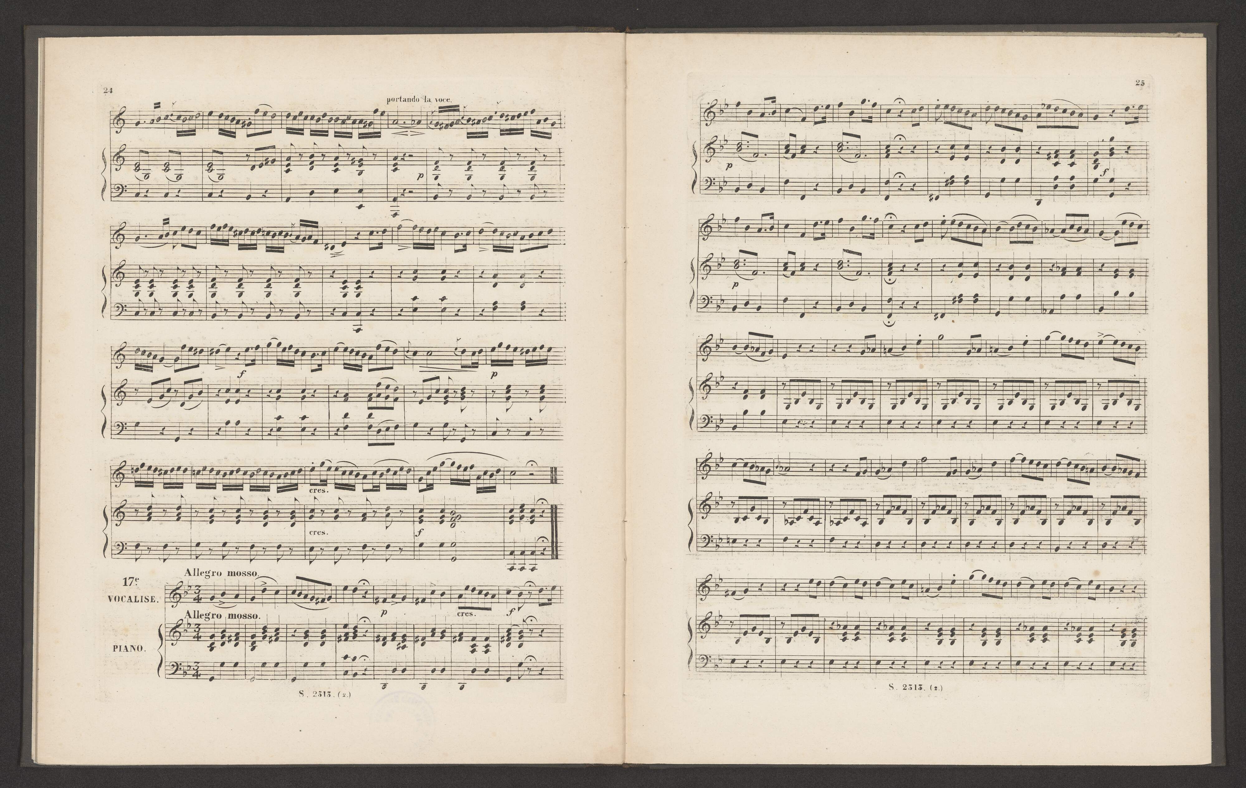 [title page, vol 1, 2, 3:] 24 SINGÜBUNGEN, | leicht und fortschreitend, | eingeführt beinn Unterricht in der Kön. Musikschule in Paris. | Vorschule zu den berühmten Vocalisen von Bordogni. | 24 | VOCALISES | Elémentaires et Graduées | avec Accompagnement de Piano | COMPOSÉES | PAR | BANDERALI. | Professeur de chant à l'Ecole Royale de Musique. | Livr I [II, III] [space] Pr 1/1/4 Thlr. | Propriété des Editeurs _ Enregistré aux Archives de l'Union. | Berlinn, chez A|d| M|t| SCHLESINGER * U. d. Linden N|o| 34. | Paris, chez M. Schlesinger. | S. 2313 (1_3) | *Editeur de Bordogni, 36 Vocalises p. Voix de Soprano ou Tenore, dito p. Basso, 12 nouv. Vocalises p. Alto, dito p. Basso ou Bariton. _ Cherubini, Solféges | du Conservatoire, p. Soprano, Alto, Tenore, Basso. 6 Livr. _Rossini, Gorghrggi e Solfeggi. _Rungenhagen, 12 u. 14 leichte Singübungen _Carulli | Donizetti, Gabussi, Vocalises facilies, amussantes et progressives. _Choix de 190 Romances favourites franç. et italiennes. _Caecilia, Choix de | 45 Duettinos favor. franç, ital. et allem