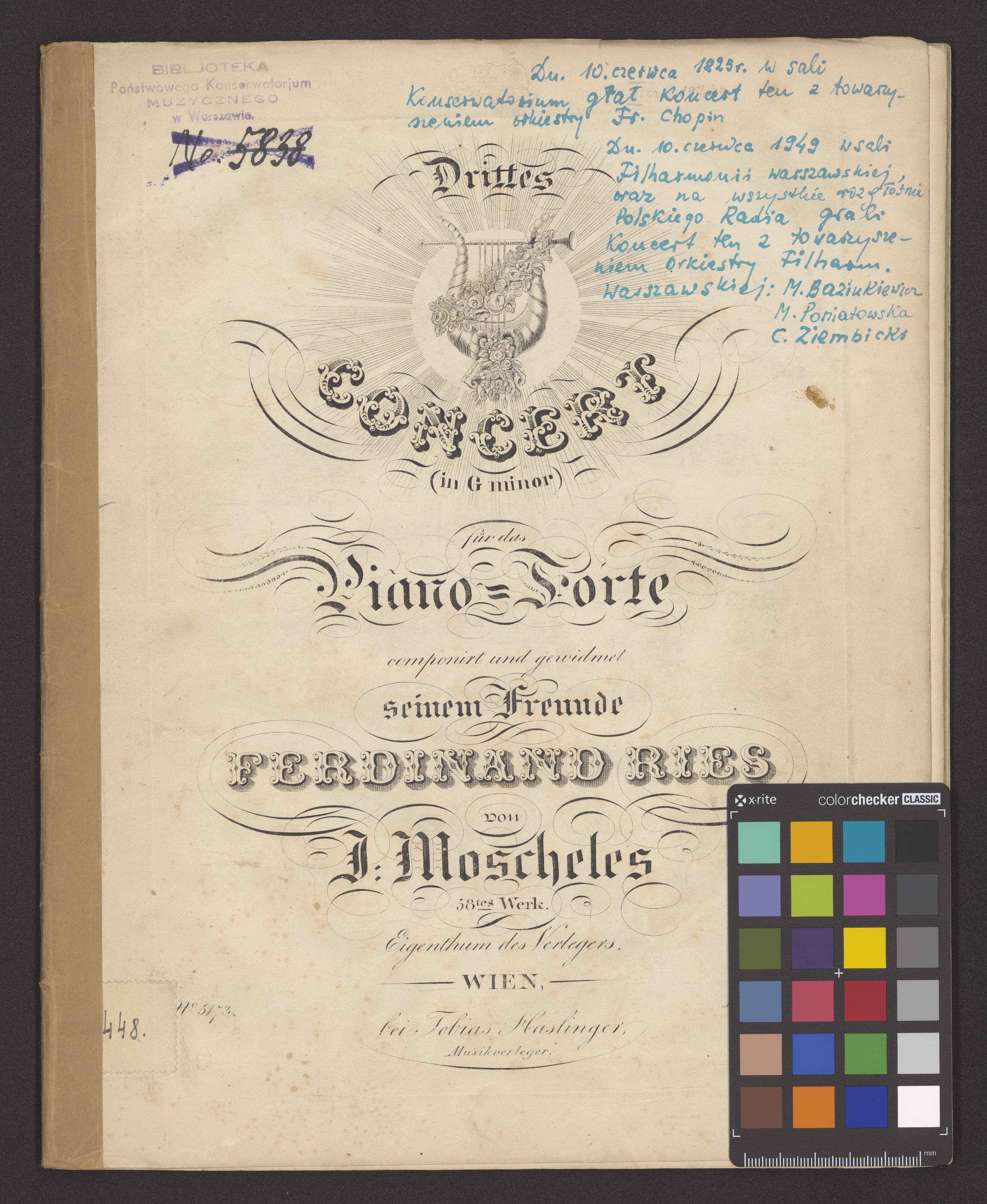 [title page:] Drittes | CONCERT | (in G minor) | für das | Piano-Forte | componirt und gewidmet | seinem Freunde | FERDINAND RIES | von | I. Moscheles | 58|t|e|s| Werk. | Eigenthum des Verlegers. | WIEN. | N|o| 5173. | bei: Tobias Haslinger. | Musikverleger