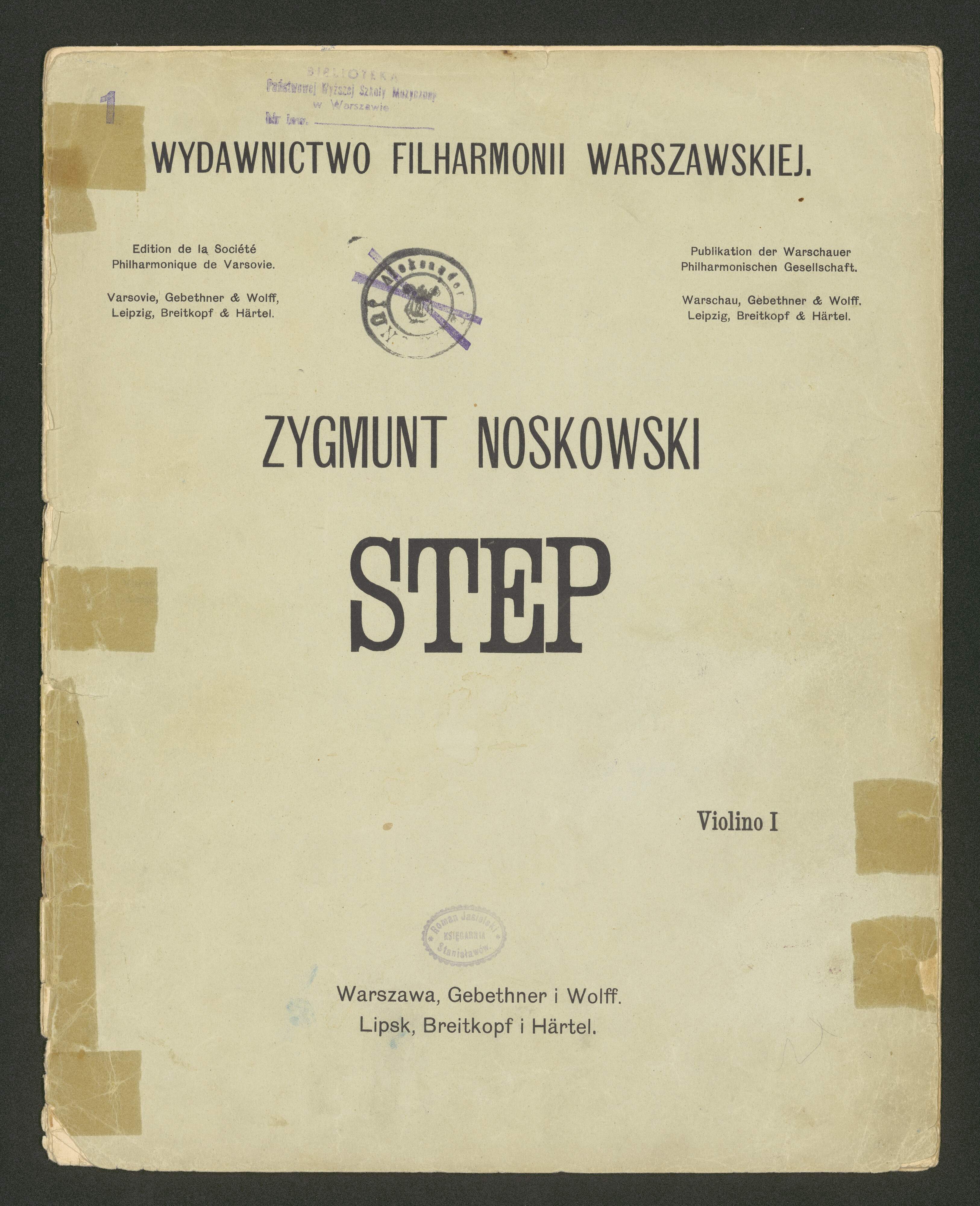 [title page:] WYDAWNICTWO FILHARMONII WARSZAWSKIEJ. | DYR. EMIL MŁYNARSKI. | [on the left side:] Edition de la Société | Philharmonique de Varsovie. | La Steppe. | Poème Symphonique | en forme d’une Ouverture de Concert | pour | Grand Orchestre | par | Sigismond Noskowski. | Op. 66. | Partition …… Fr. 18.- net. | Parties …… Fr. 25.- net. | Parties supplementaires: | V. I, V. II …. à Fr. 1.75 net. | Alto, Cello, Basso . à Fr. 1.50 net. | Varsovie, Gebethner & Wolff, | Leipzig, Breitkopf & Härtel. [on the right side:] Publikation der Warschauer | Philharmonischen Gesellschaft. | Die Steppe. | Symphonische Dichtung | in Form einer Concert-Ouverture | für | Grosses Orchester | von | Siegmund Noskowski. | Op. 66. | Partitur …… M. 14.- net. | Orchesterstimmen … M. 20.- net. | Streichquintettstimmen: | V. I, V. II …. à M. 1.40 net. | Viola, Cello, Basso . à M. 1.20 net. | Warschau, Gebethner & Wolff. | Leipzig, Breitkopf & Härtel. | [in the middle:] STEP | POEMAT SYMFONICZNY | w formie Uwertury Koncertowej na wielką orkiestrę | napisał | ZYGMUNT NOSKOWSKI. | op. 66. | Warszawa, Gebethner i Wolff. | Lipsk, Breitkopf i Härtel. | [on the left side:] Partytura … R. 6.50 net. | Głosy ….. R. 9.00 net. [on the right side:] Głosy kwintetu smyczkowego | V. I, V. II à kop. 65 net. | Viola, Cello, Bas à kop. 50 net