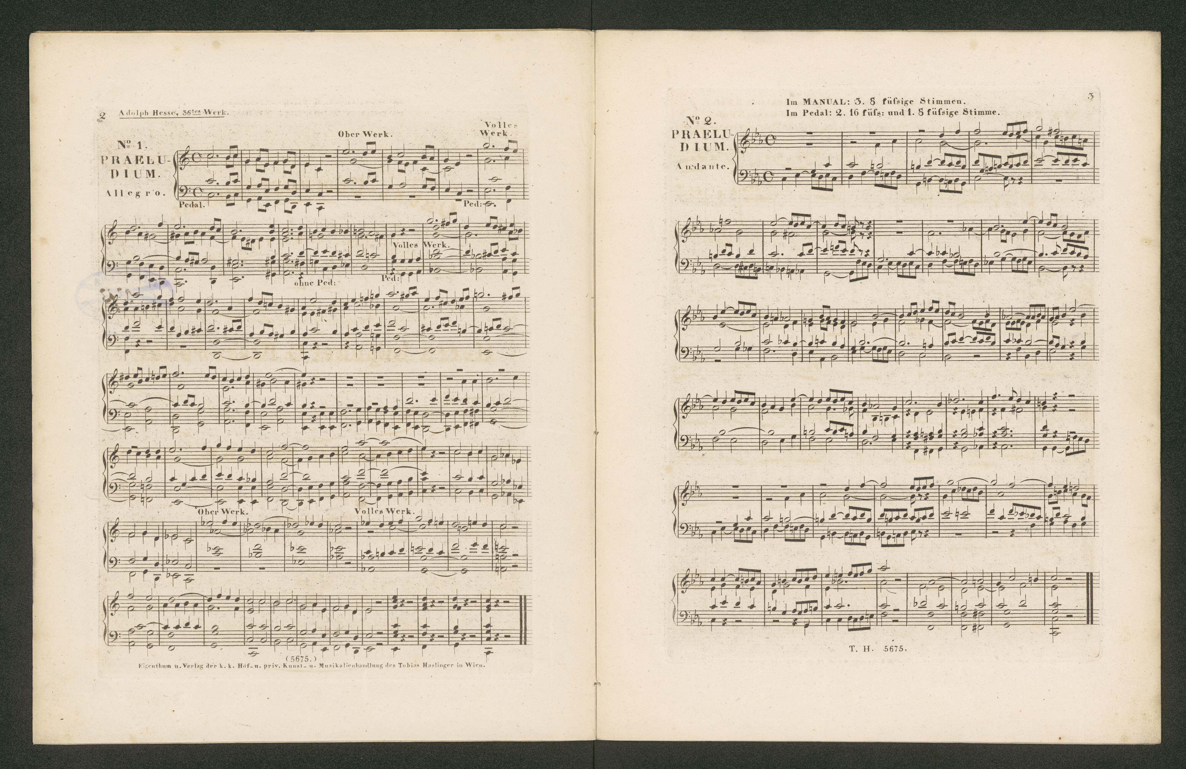 ORGEL-COMPOSITIONEN. | Enthaltend: | 3 Präludien, 1 Trio und 1 Fantasie | für das Concert. | Componirt, und dem | Herrn Raphael G. Kiesewetter, | k. k. wirkl. Hofrath, und Hofkriegs: Kanzleydirector &. &. | in Wien | Hochachtungsvoll zugeeignet | von | ADOLPH HESSE, | 1|t|e|r Organist an der evangel. Haupt-u. Pfarrkirche S|t Bernhardin zu Breslau. | 36|t|e|s Werk. | (N|o 22 der Orgelsachen.) | Eigenthum des Verlegers. | Eingetragen das Archiv der vereinigten Musikalienhändler. | N|o 5675. | Wien, bei Tobias Haslinger, | k.k. Hof-u. priv. Kunst-u. Musikalienhändler. | Graben N|o 572