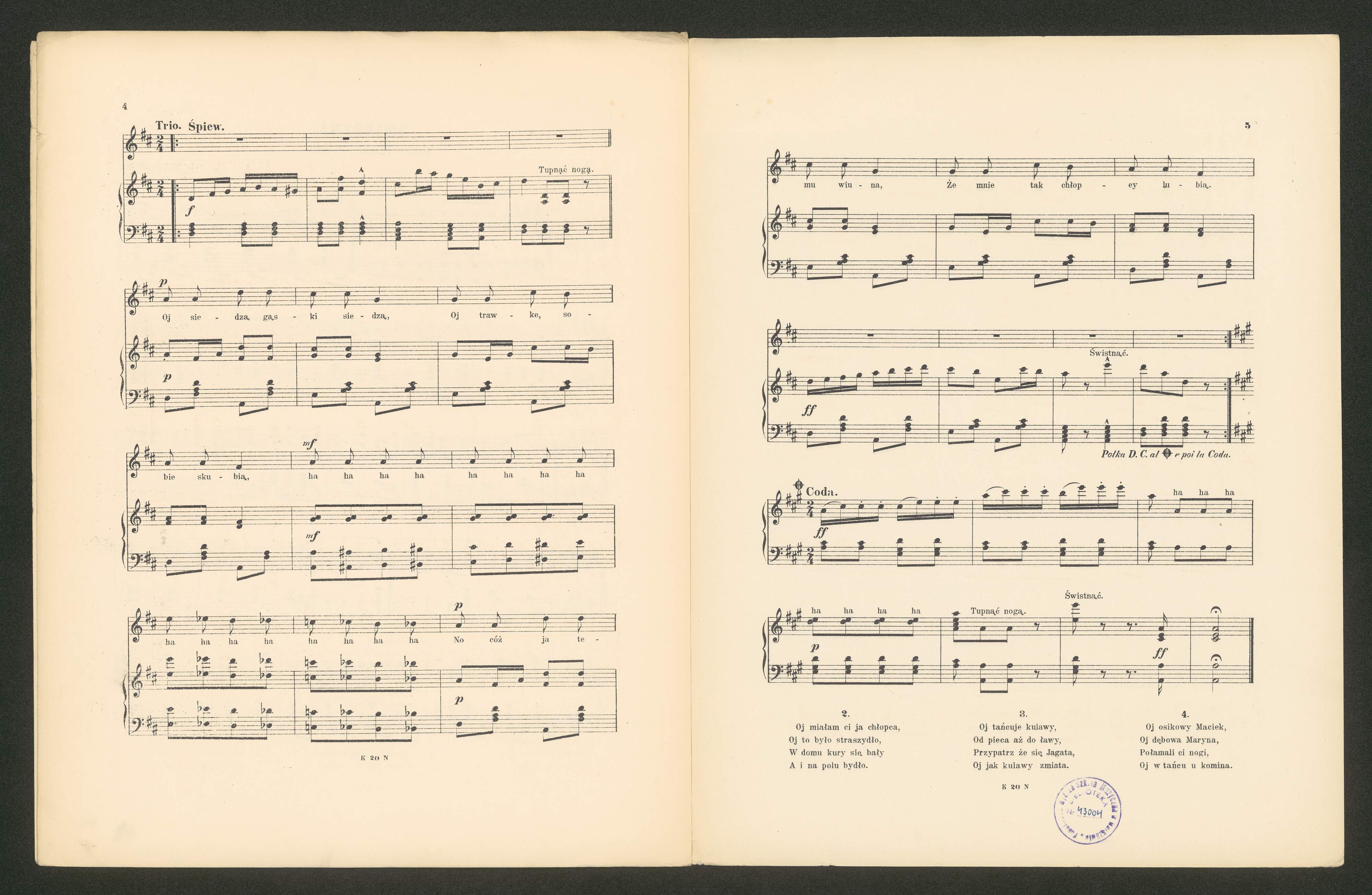 [title page:] „ŚMIESZKA” | Polka-Humorystyczna | PRZEZ | KAROLA NAMYSŁOWSKIEGO. | Cena 40 kop. | Nakład i własność Autora | SKŁAD GŁÓWNY | WARSZAWA | GEBETHNER I WOLFF | Dostawcy Warszawskiego Instytutu Muzycznego (Konserwatorium) | oraz dostawcy i komisjonerzy Warszawskiego Towarzystwa Muzycznego. | FILJE: LUBLIN - ŁÓDŹ. | [list of distributor] | LIT. J. F. KONARZEWSKI i MĘKARSKI w WARSZAWIE NOWY ŚWIAT 47