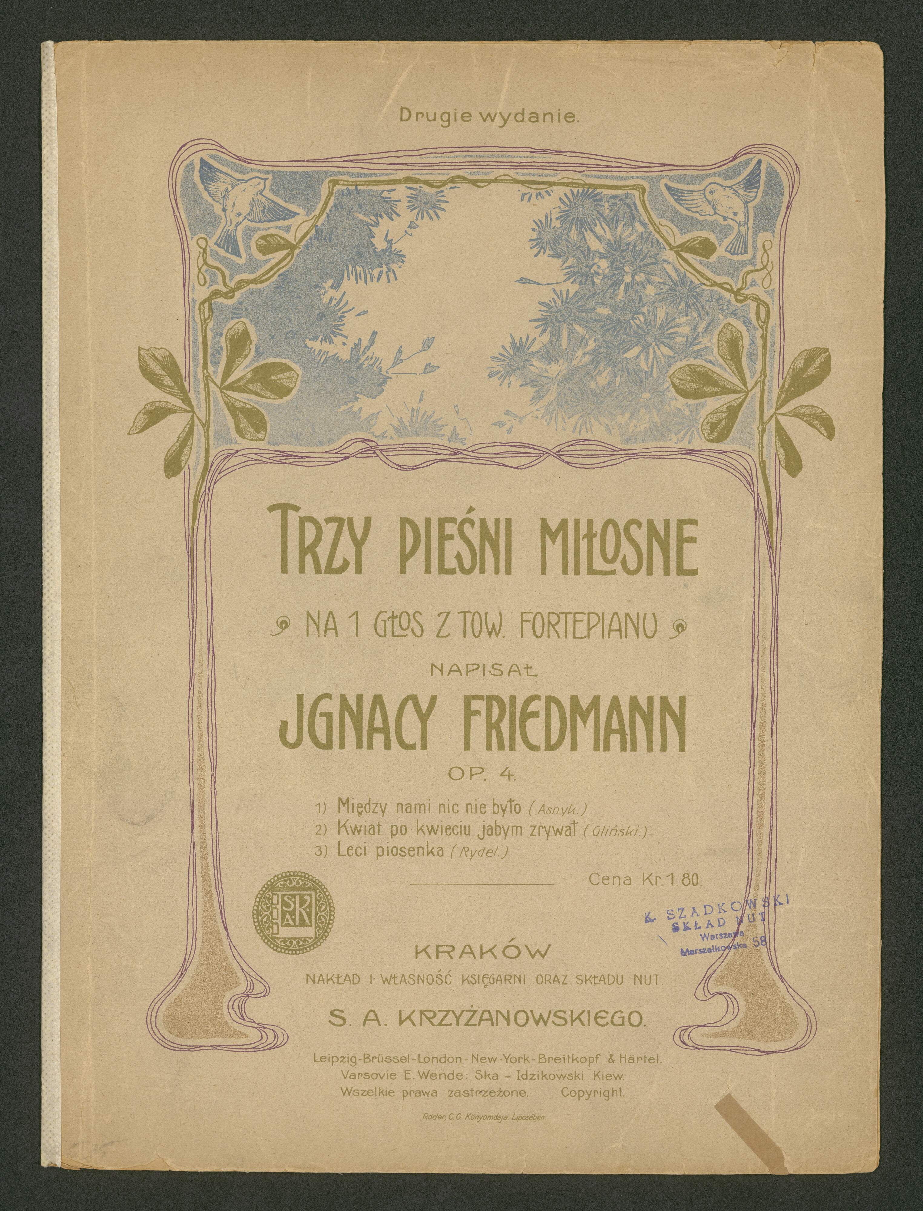 [title page:] Drugie wydanie | TRZY PIEŚNI MIŁOSNE | NA 1 GŁOS Z TOW. FORTEPIANU | NAPISAŁ | IGNACY FRIEDMANN | OP. 4 | 1) Między nami nic nie było (Asnyk) | 2) Kwiat po kwieciu jakbym zrywał (Gliński) | 3) Leci piosenka (Rydel.) | Cena Kr. 1.80 | KRAKÓW | NAKŁAD I WŁASNOŚĆ KSIĘGARNI ORAZ SKŁADU NUT. | S. A. KRZYŻANOWSKIEGO. | Leipzig-Brüssel-London-New-York-Breikopf & Härtel. | Varsovie E. Wende: Ska-Idzikowski Kiew. | Wszelkie prawa zastrzeżone. Copyright. | Röder, C. G. Könyomdaja, Lipcsében