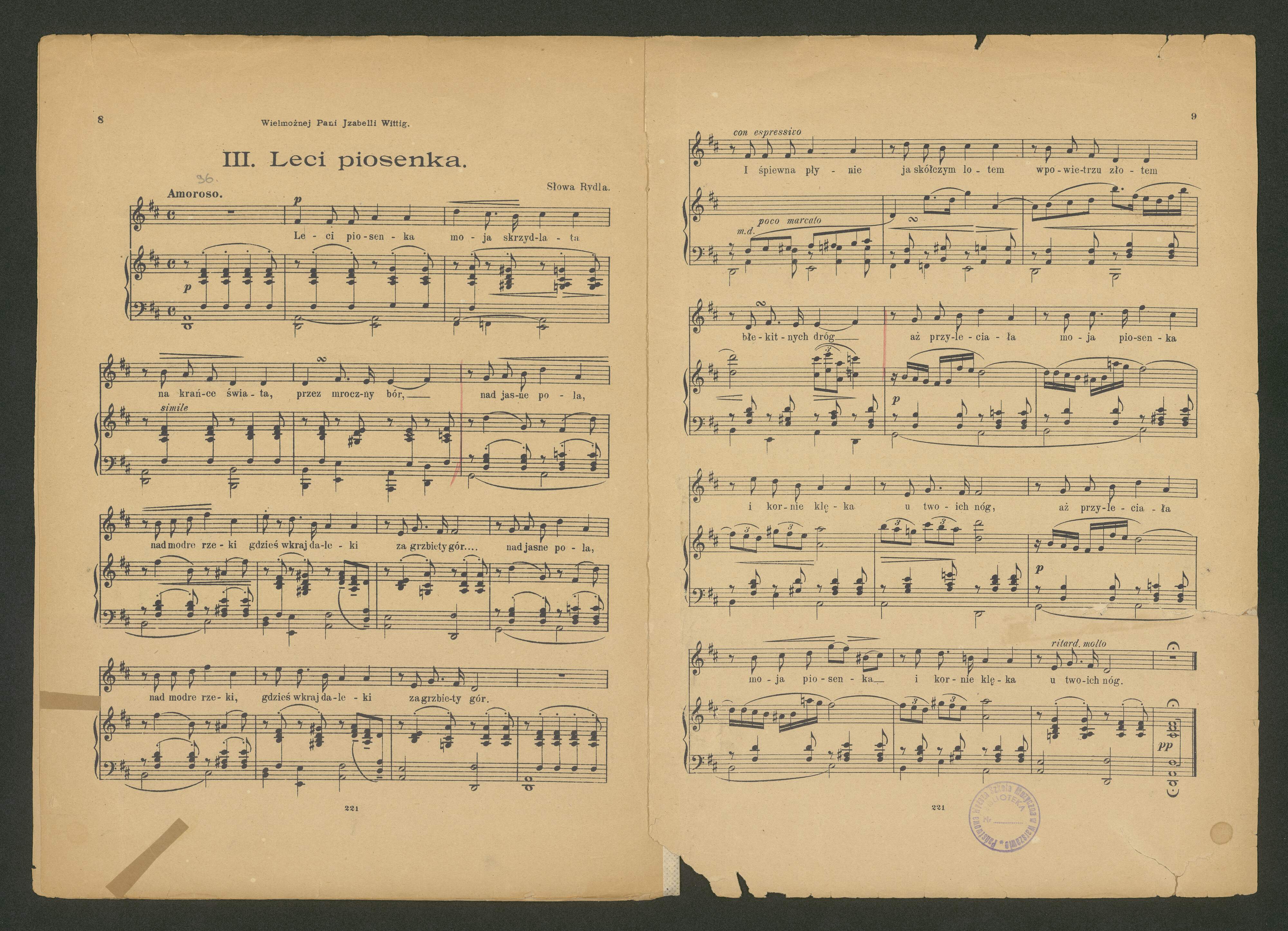 [title page:] Drugie wydanie | TRZY PIEŚNI MIŁOSNE | NA 1 GŁOS Z TOW. FORTEPIANU | NAPISAŁ | IGNACY FRIEDMANN | OP. 4 | 1) Między nami nic nie było (Asnyk) | 2) Kwiat po kwieciu jakbym zrywał (Gliński) | 3) Leci piosenka (Rydel.) | Cena Kr. 1.80 | KRAKÓW | NAKŁAD I WŁASNOŚĆ KSIĘGARNI ORAZ SKŁADU NUT. | S. A. KRZYŻANOWSKIEGO. | Leipzig-Brüssel-London-New-York-Breikopf & Härtel. | Varsovie E. Wende: Ska-Idzikowski Kiew. | Wszelkie prawa zastrzeżone. Copyright. | Röder, C. G. Könyomdaja, Lipcsében